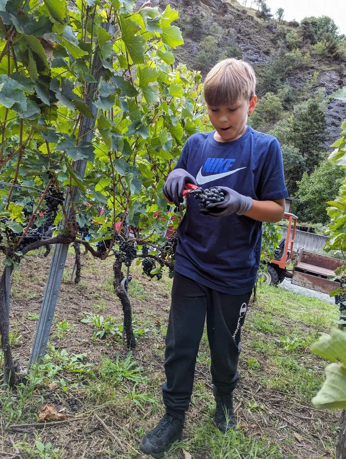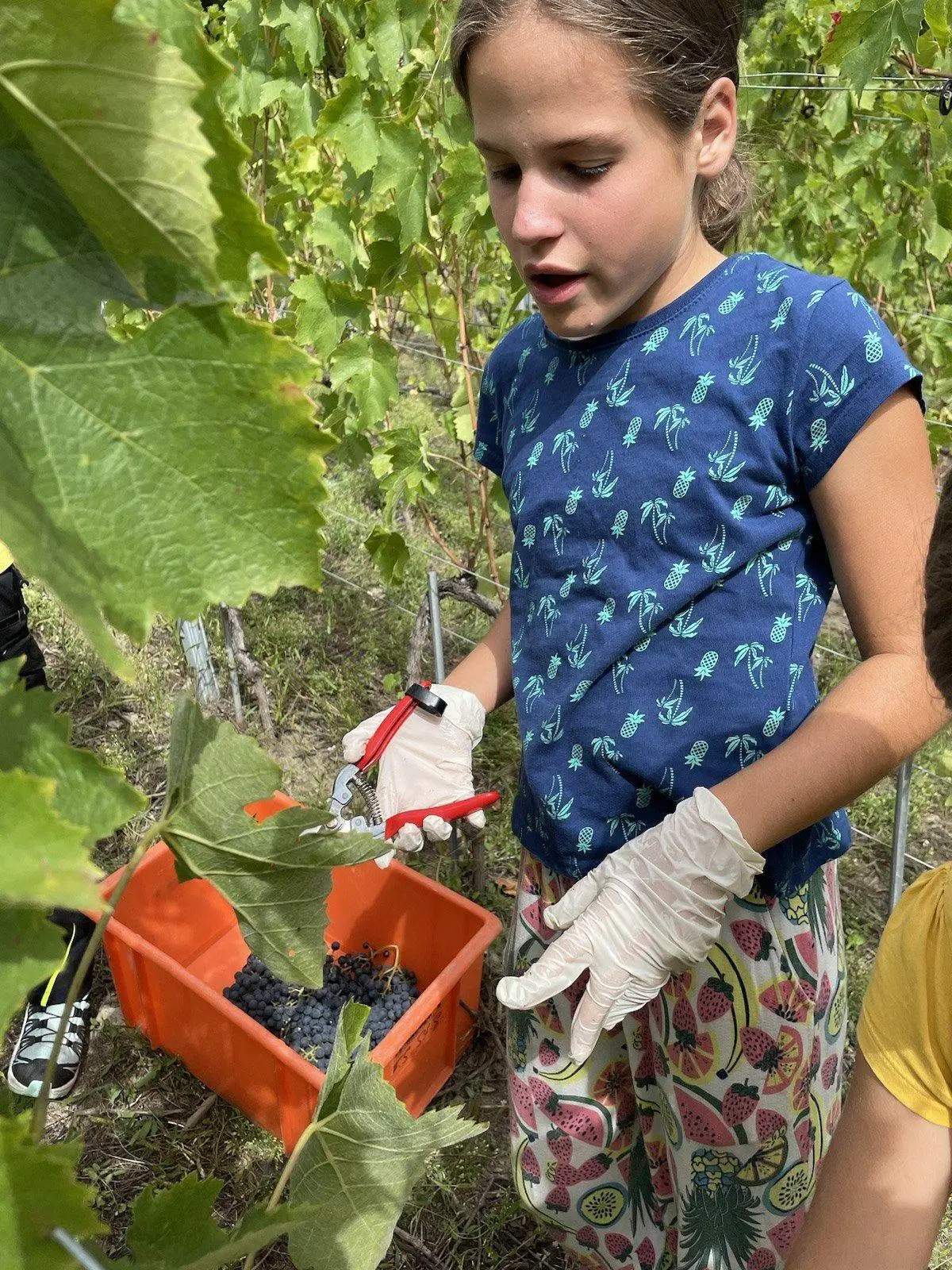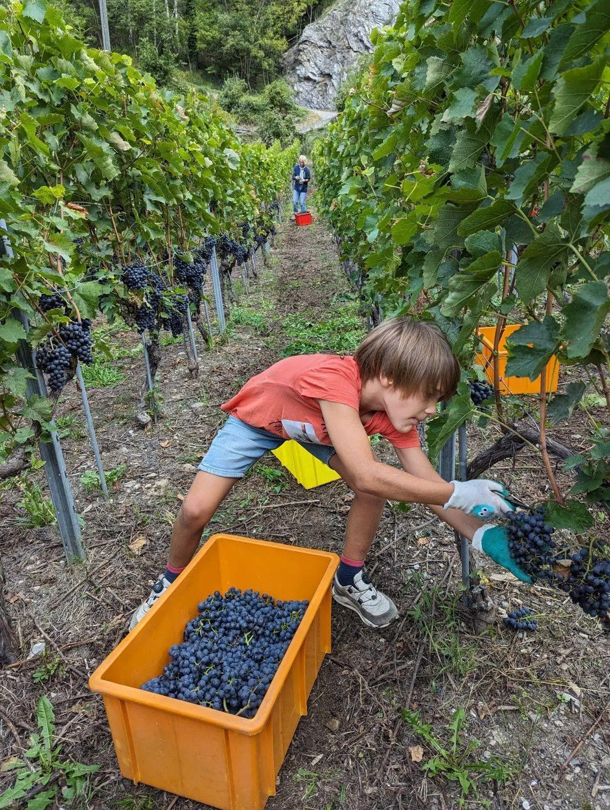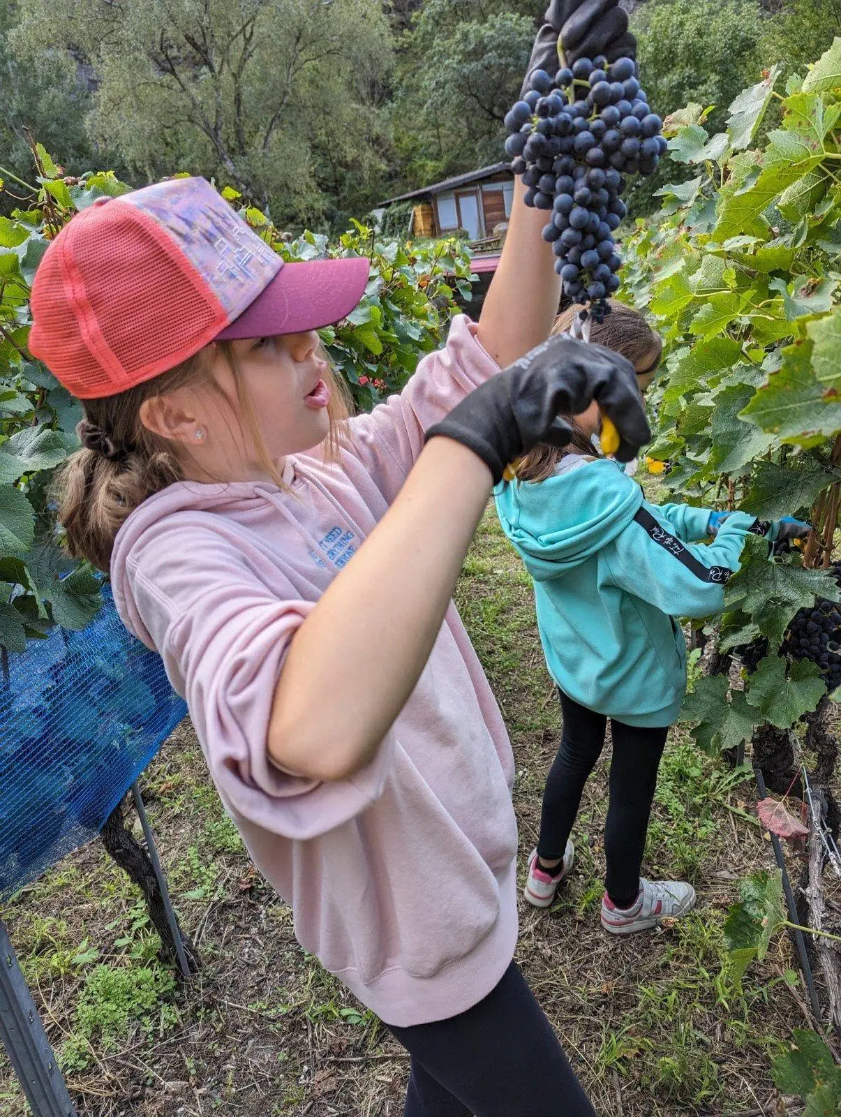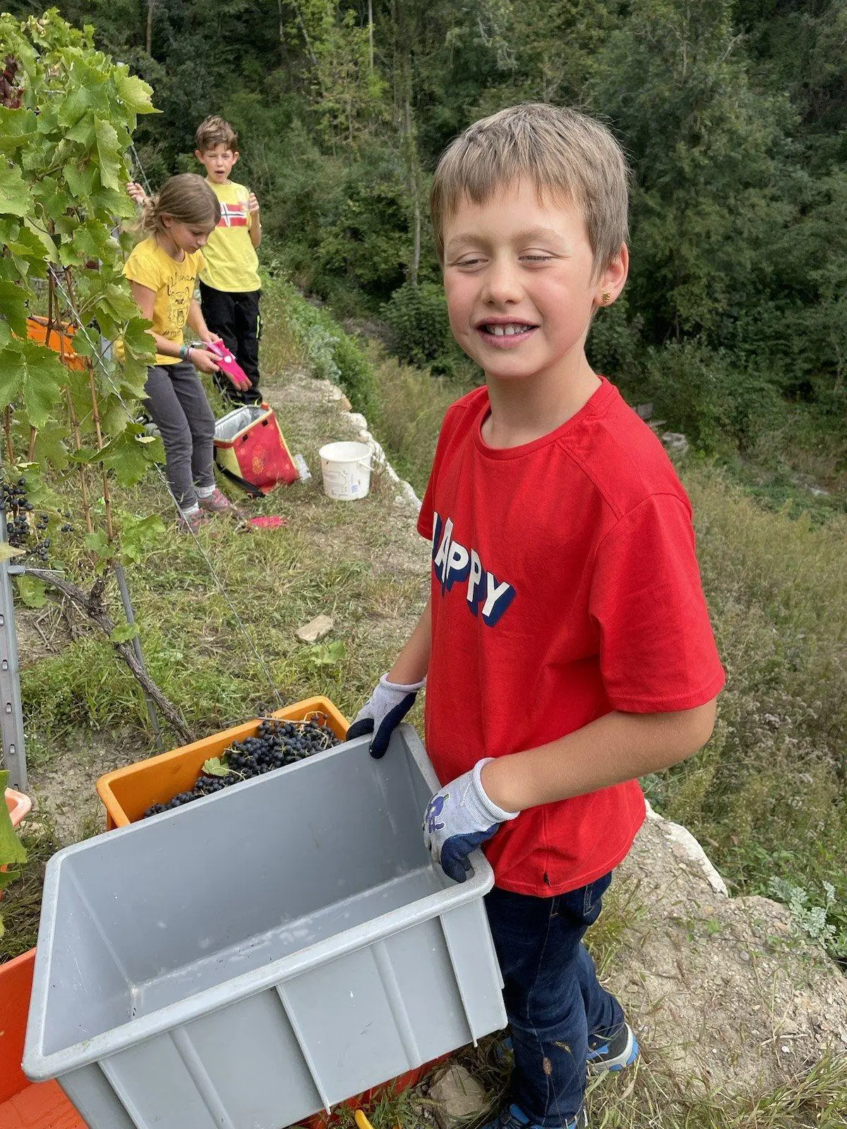 Wir haben die Trauben geerntet, in Kisten verpackt und transportiert. Anschliessend durften wir auch vom Traubensaft kosten. Er war sehr lecker.